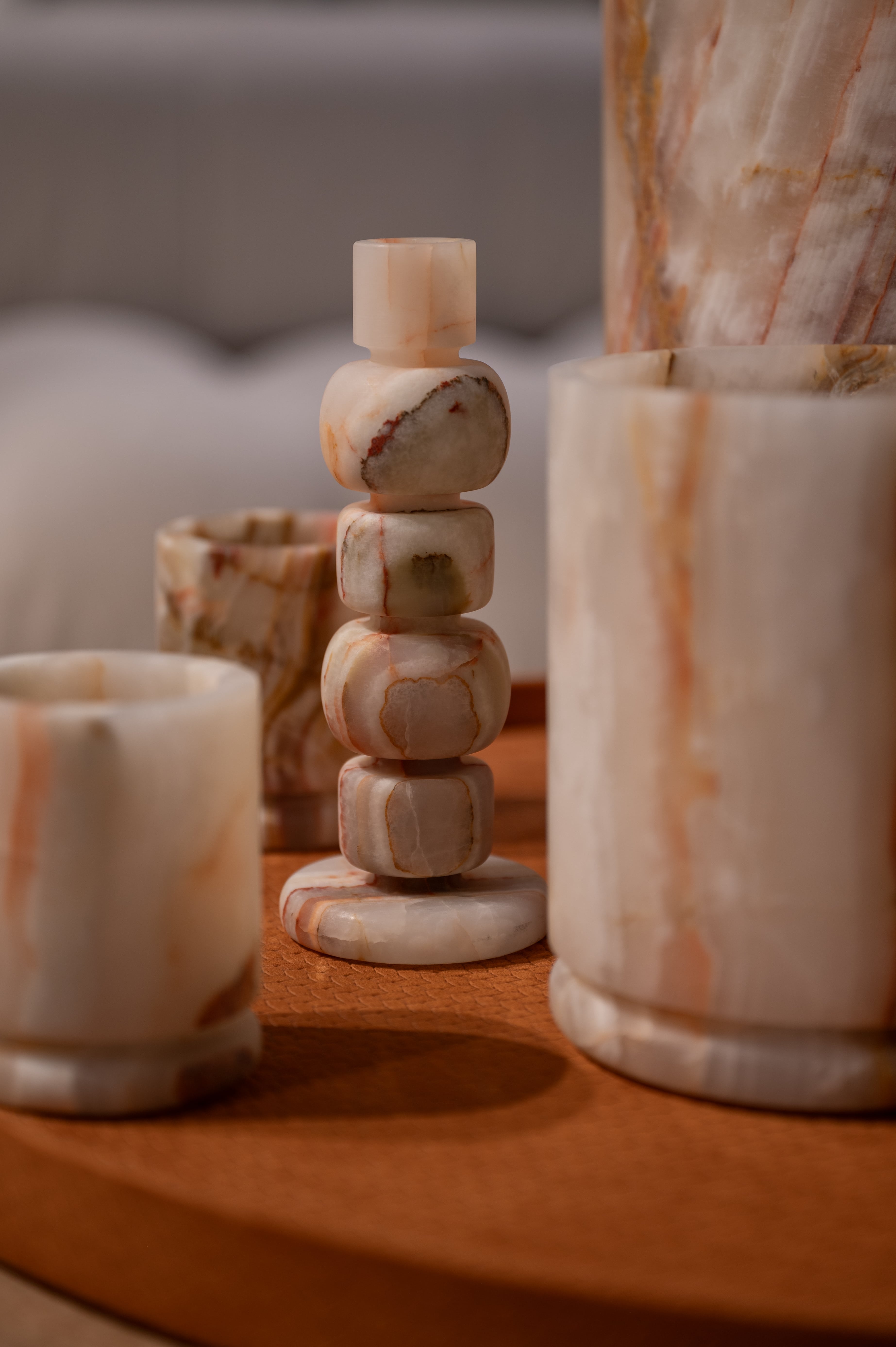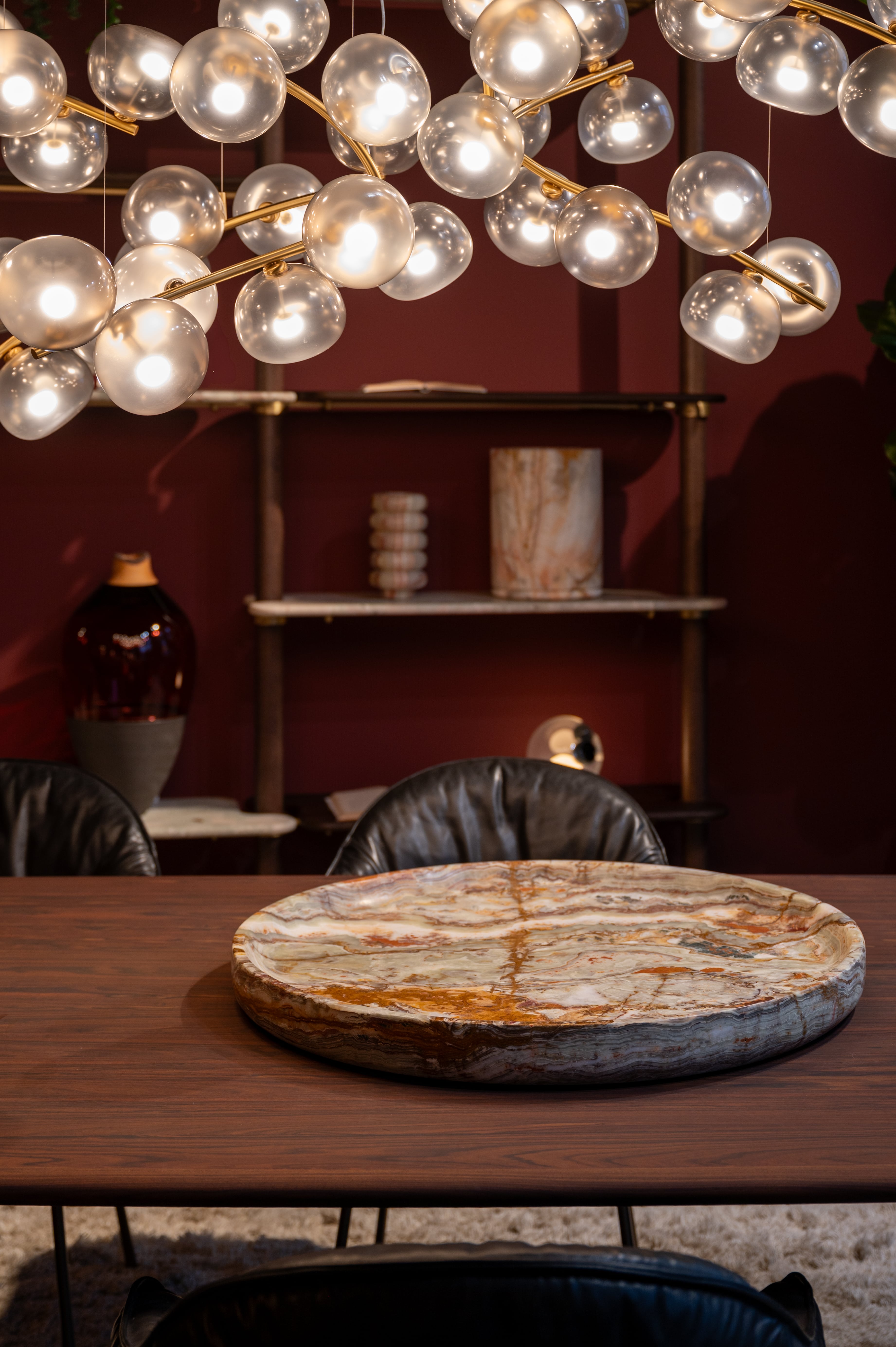 Amsterdam-based designer Dayinne Potuyt draws inspiration from the natural beauty of onyx and uses its patterns and luminosity to create luxurious, minimalist pieces that connect people, nature and art with warmth and serenity. Influenced by the vibrant city life and tranquil surroundings of Amsterdam, Dayinne creates objects that evoke emotion and play with light, preserving the inherent beauty of the stone with minimal intervention. For her, onyx is a creative playground where each design reveals the material's full potential.
