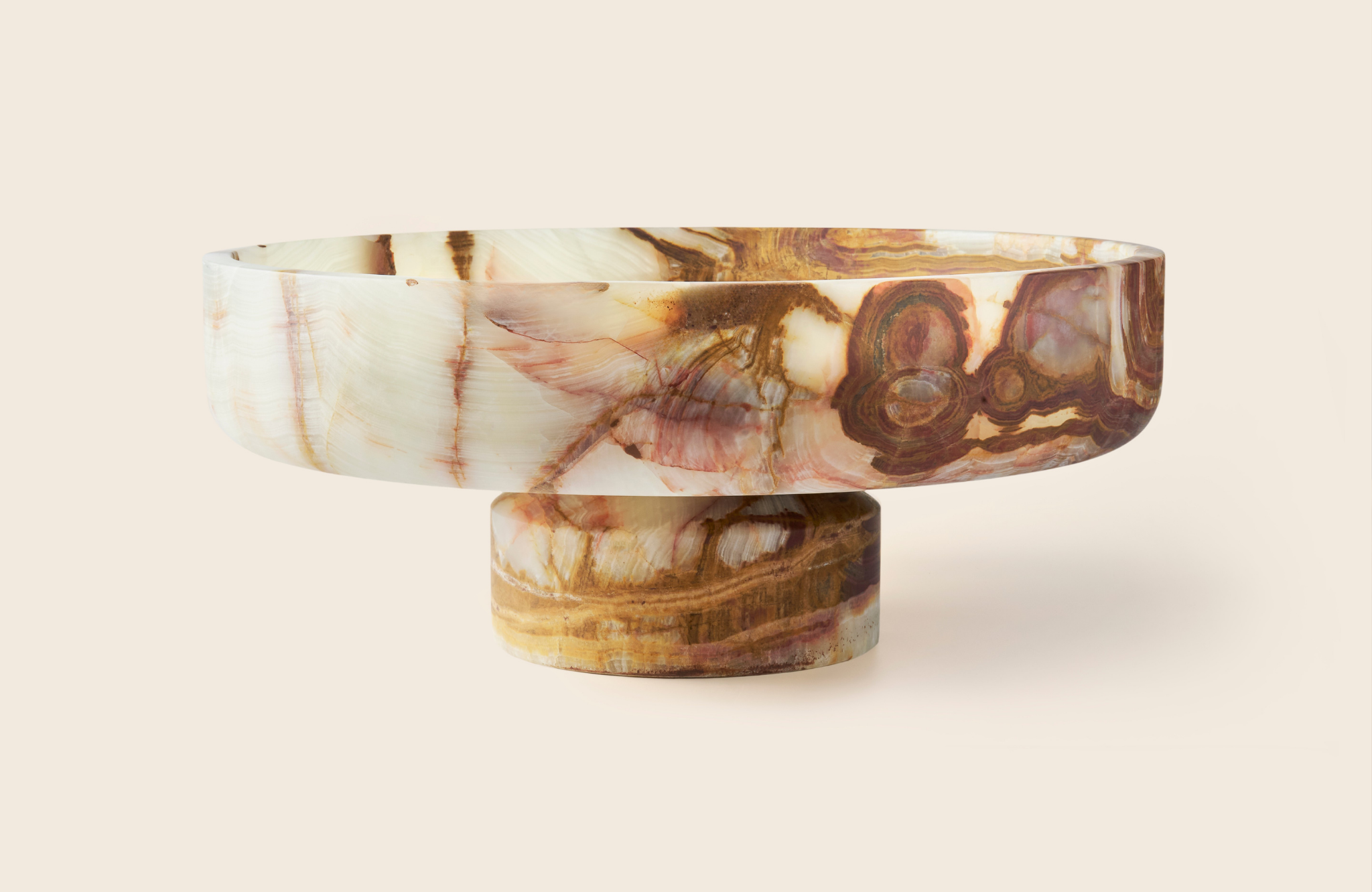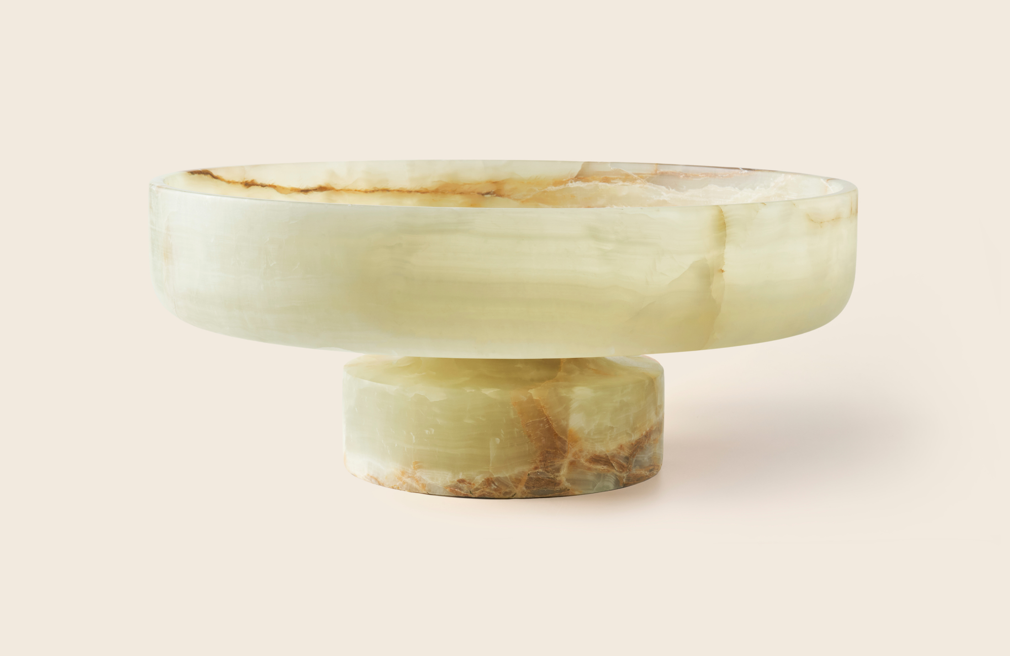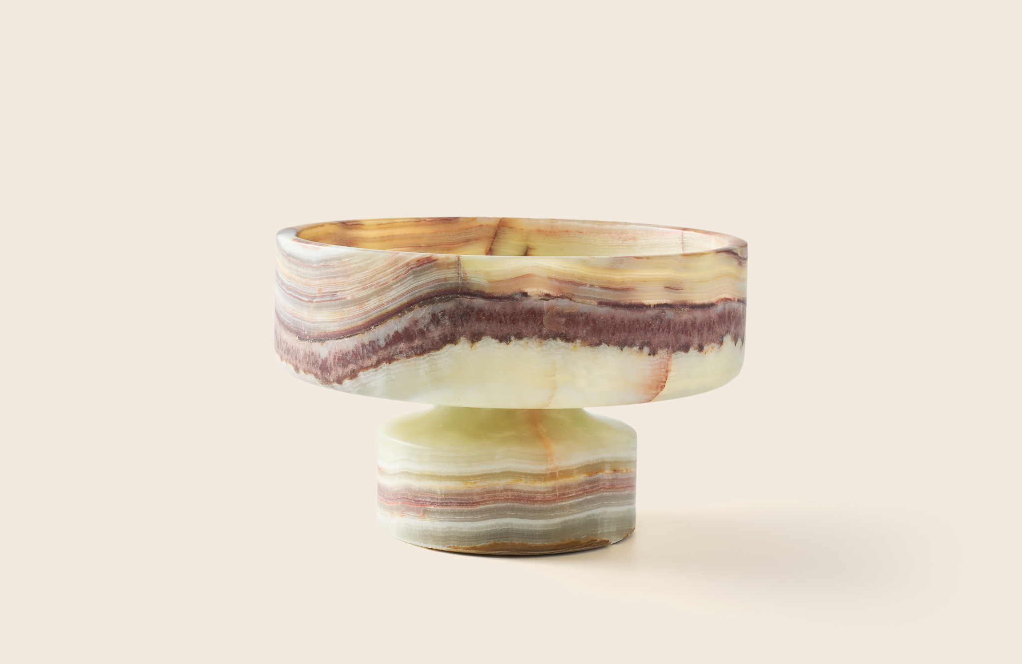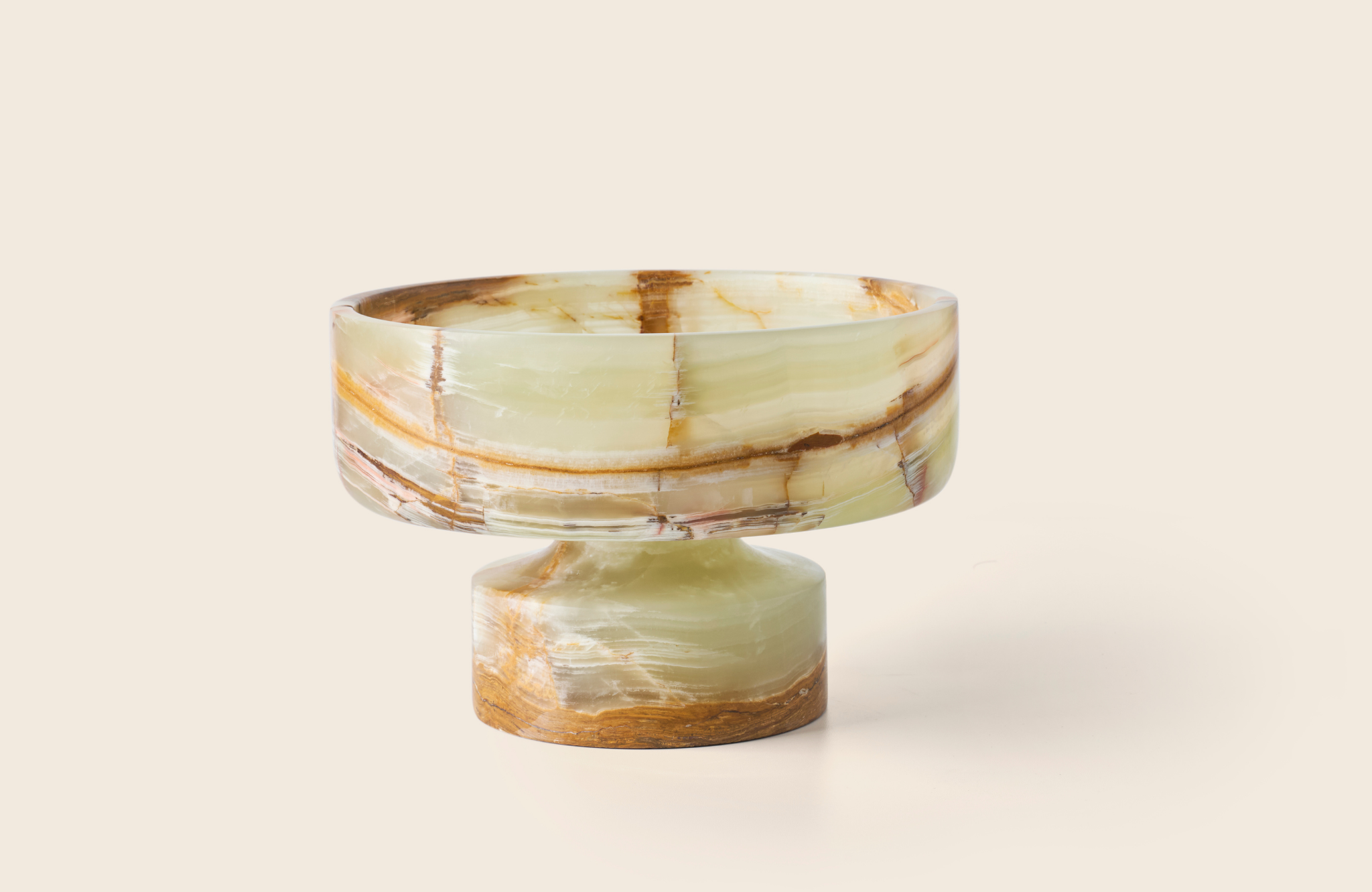 A raised onyx bowl in soft tones with subtle or expressive veining. The rounded bowl rests on a refined pedestal base, where the neck flows gracefully inward before widening into a stable foot. The delicate translucency of the stone brings quiet elegance and depth to any refined interior. Due to the natural character of onyx, each piece varies in colour, veining, shape and texture from reference images.