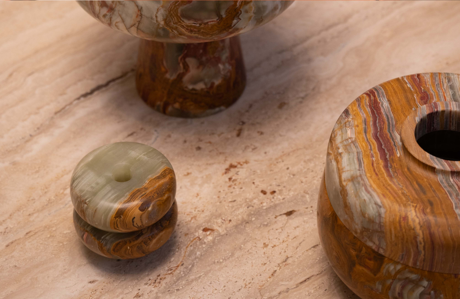 Sourced from South America and the Middle East, our onyx is carefully selected  and extacted by small, dedicated teams. We search for exceptional quality and rare character. Onyx is known for its unique veining, depth, and soft translucency, qualities that make every piece one of a kind and truly timeless. To preserve its beauty, every object is finished with a protective wax, a technique also used in museums.